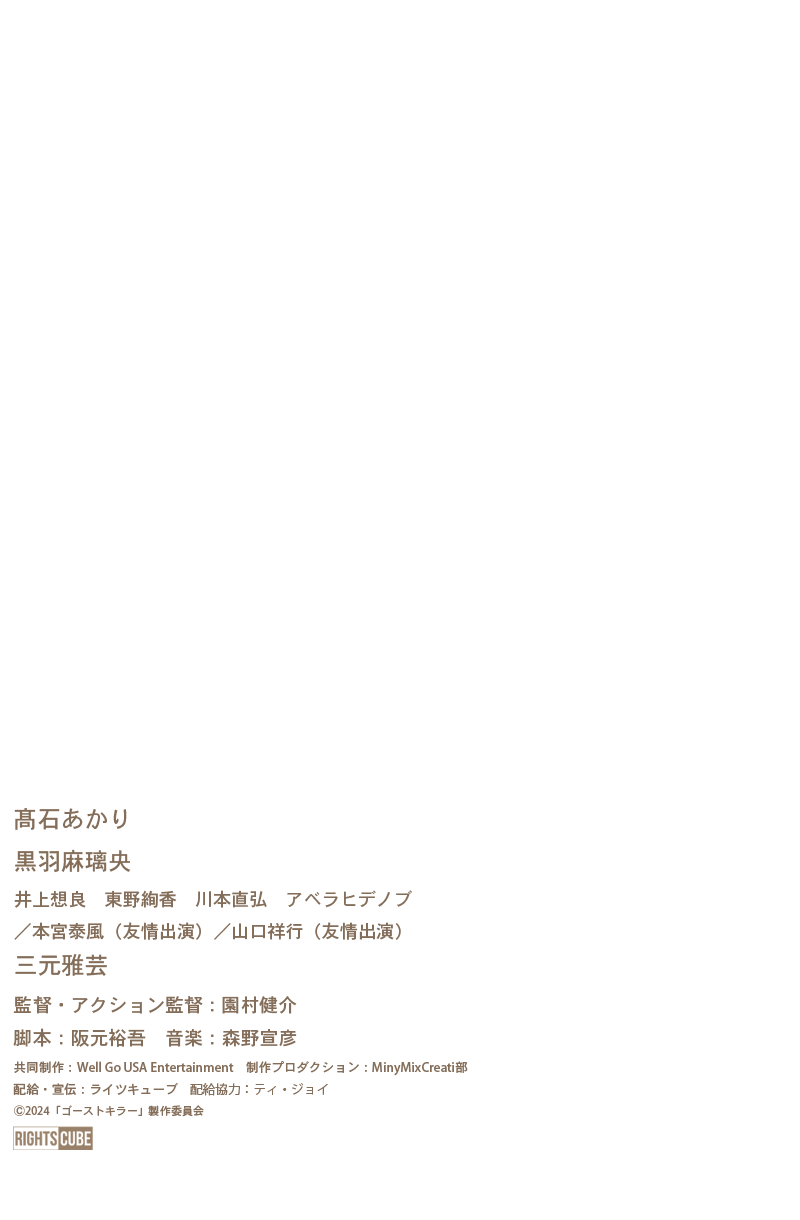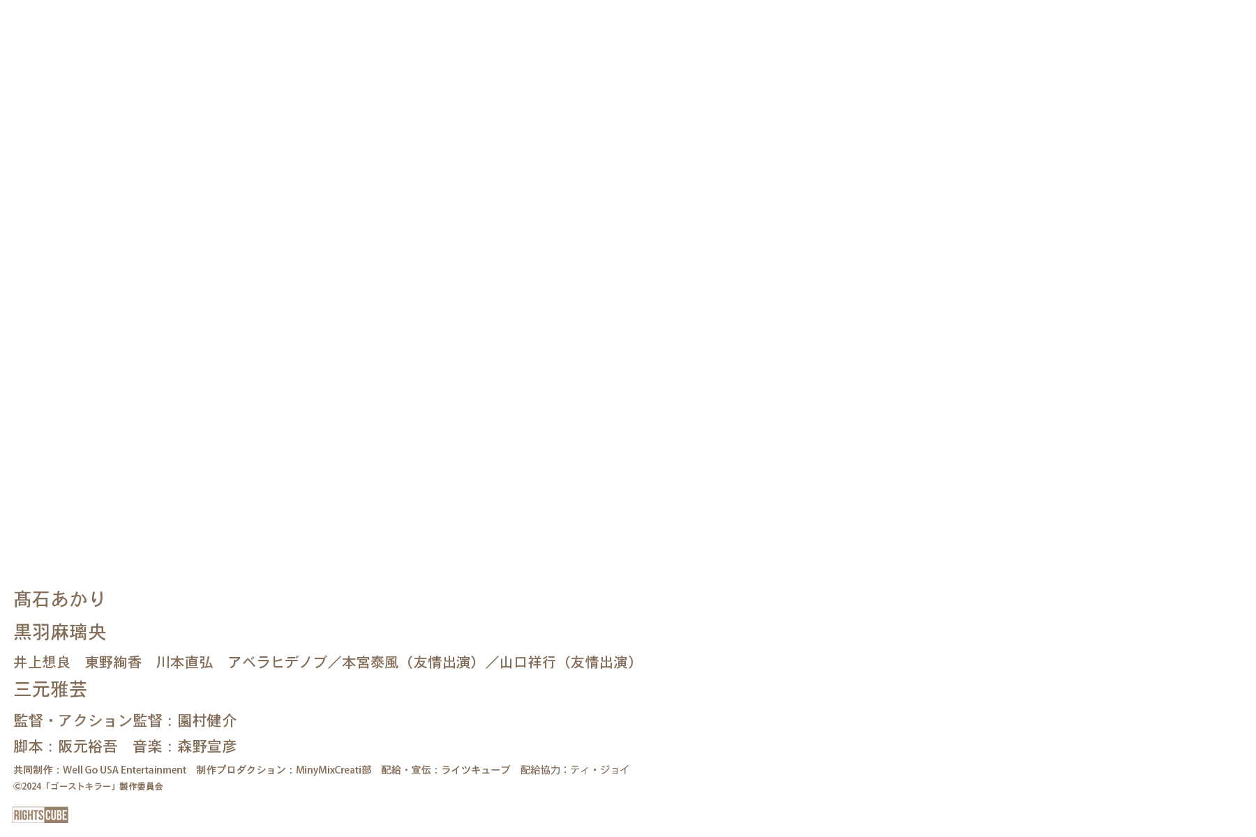 髙石あかり 黒羽麻璃央 井上想良 東野絢香 川本直弘 アベラヒデノブ / 本宮泰風(友情出演) / 山口祥行(友情出演) 三元雅芸 監督・アクション監督:園村健介 脚本:阪元裕吾 音楽:森野宣彦 共同制作:Well Go USA Entertainment 制作プロダクション:MinyMixCreati部 配給・宣伝:ライツキューブ Ⓒ2024「ゴーストキラー」製作委員会